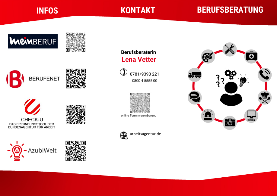 Mein Name ist Lena Vetter . Ich bin Berufsberaterin der Agentur für Arbeit in Offenburg, mit Büro in der Agentur in Offenburg.