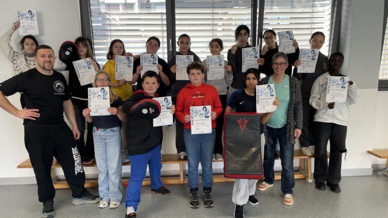 Zum Bild: Schülerinnen und Schüler aus Klasse 6 mit Schulsozialarbeiterin Jutta Kempf und Protactics- Trainer Lukas Dittus an der August- Ganther- Schule